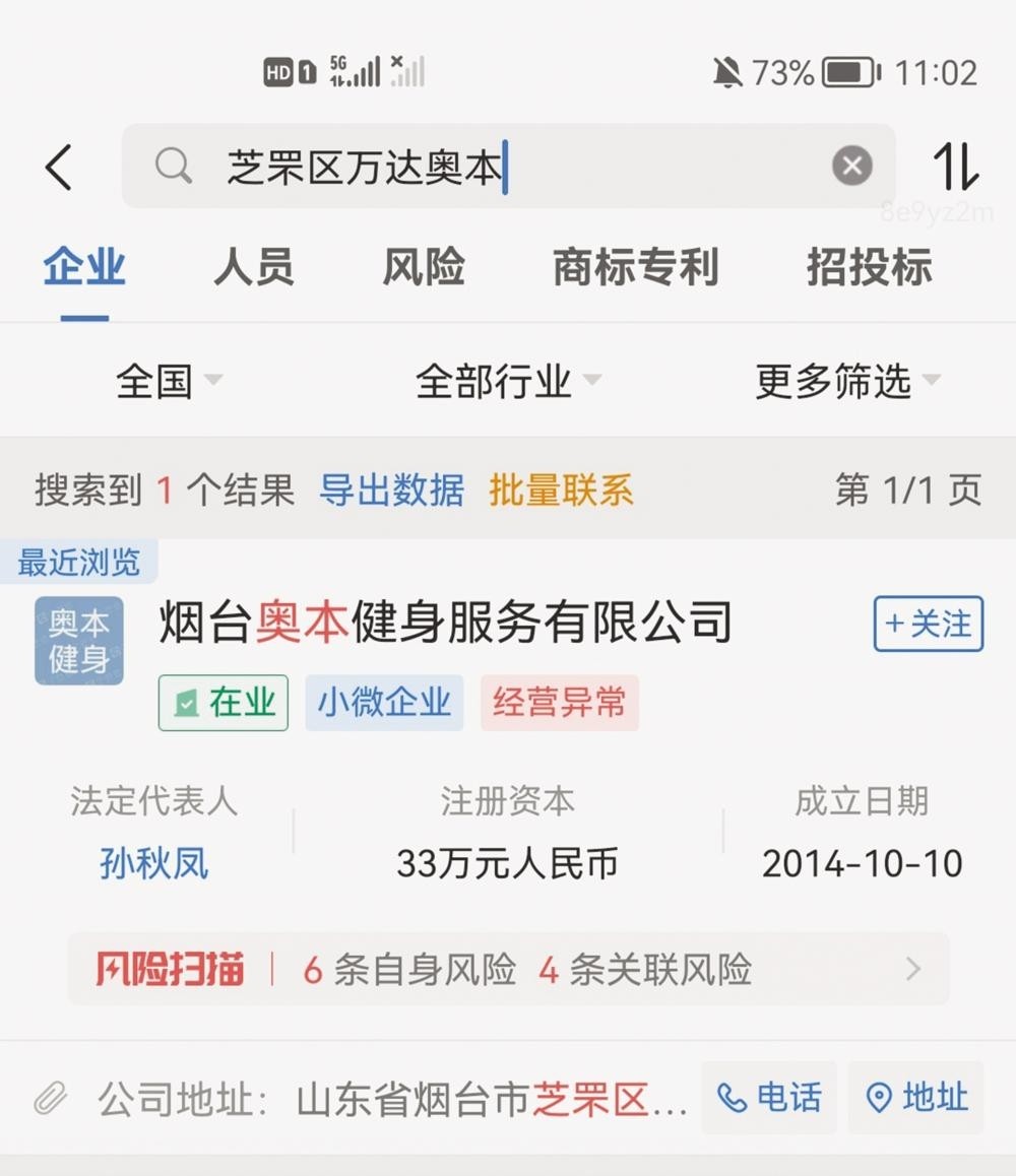 从企查查可知,奥本健身芝罘区万达广场店的背后是一家名为烟台奥本健身服务有限公司的机构,注册资金33万元。短短8年时间,依靠固有商业模式,奥本健身不断在烟台市区开枝散叶,其中就包括开发区星颐广场店、芝罘区振华商厦店、阳光100广场店等。