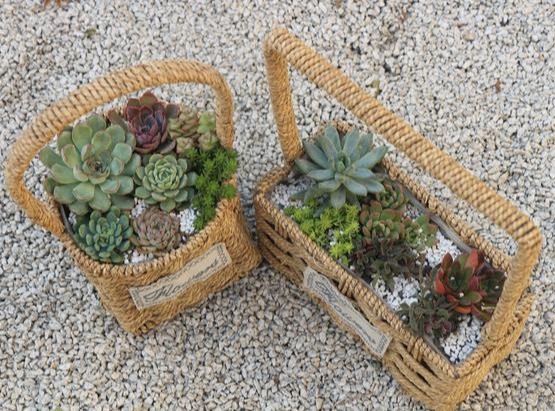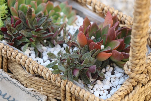 我选择的盆器是草编盆,里面有一层塑料薄膜,在种植之前已经扎破了几个洞,所以不用担心透水透气问题。然后做了一个对比,圆盆里种的相对来说比较密,而且用的都是花月夜、冬美人这种比较叶片肥厚的品种,铺面也是星乙女和佛甲草,看起来都比较肥肥的,所以刚种完效果看起来就不错,有一种肉肉挤在一起的感觉;而长盆里种的相对来说比较稀,选择的是蓝黛莲、花簪和万年草,所以刚种完看起来稀稀拉拉的不好看,而且空空的。