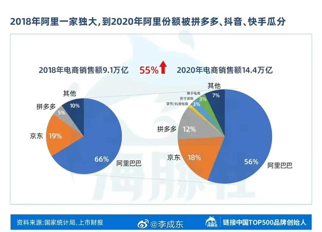 对此,电商战略分析师李成东指出,阿里巴巴的市场份额从2018年的66%,下降到2020年的56%,两年时间下降幅度达到了10%。而随着抖音和快手直播电商崛起,阿里市场份额在2021年可能进一步下滑到50%以下。