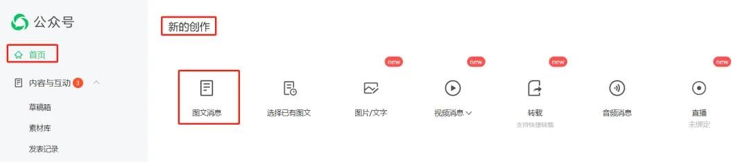 首页下拉,找到新的创作,点击图文消息就可以去写文章了。