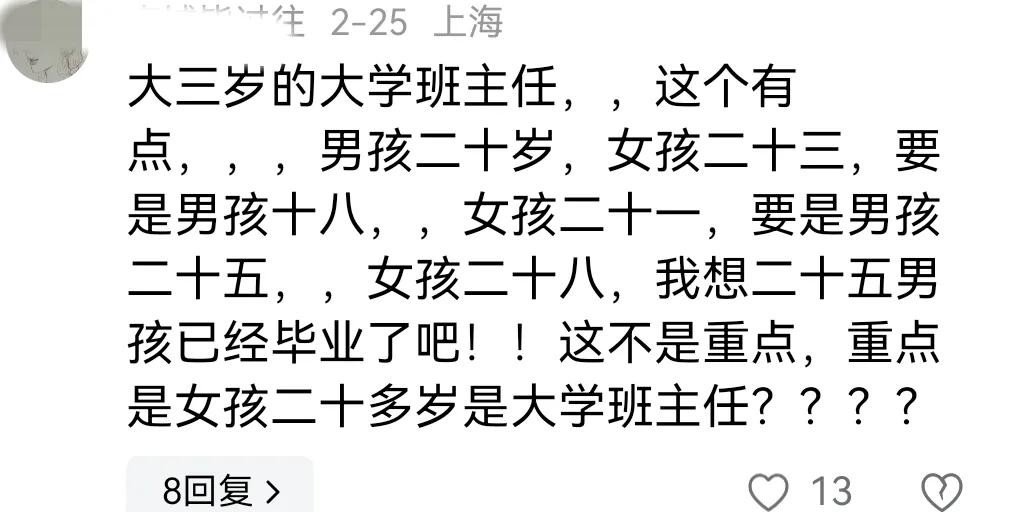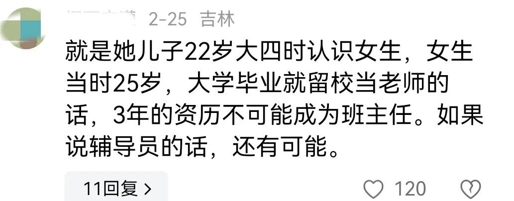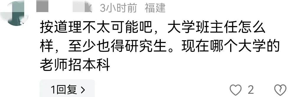 也有网友在评论区提出质疑,怀疑林女士的说法太荒唐,大三岁怎么能成为大学班主任呢?