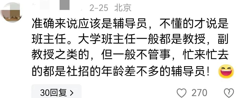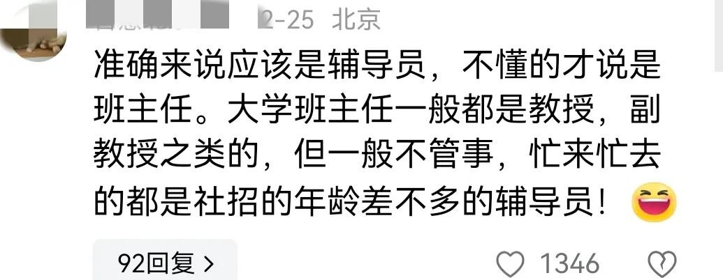对此,有网友在评论区进行了答疑解惑,表示所谓的班主任,大概率是辅导员,日常并不承担教学工作,只是为学生处理一些日常事务。