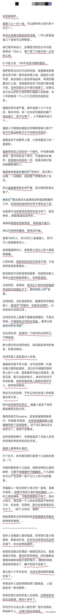 你们河南人不会懂的,我一个潮汕人就能明白福建人的感受,我们这边是真的没有几块像样的农田,不是赶上海洋贸易的时代我们得穷死,大山大河对我们来说管个屁用,又不能产粮食