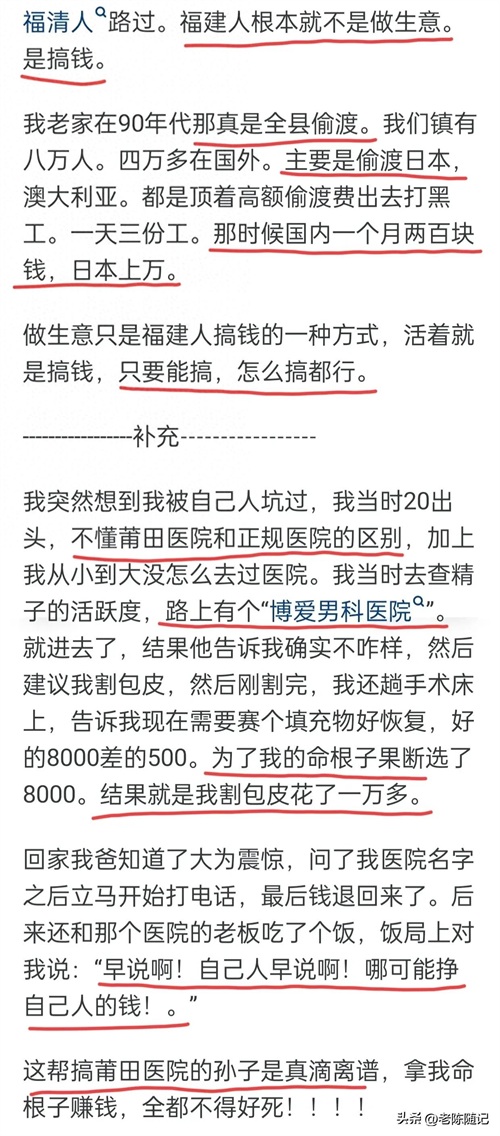 之前看过一个福清人的报道,国内几十块钱一个月的年代,去日本,一天能赚国内一年的钱;舍不得回国探亲(毕竟是偷渡,来回都得用命博),在日本待了几十年,期间没跟老婆孩子见过面,赚了钱就寄回家,把女儿培养到去国外读医学博士;说这辈子就这样了,期望孩子有出息就行...