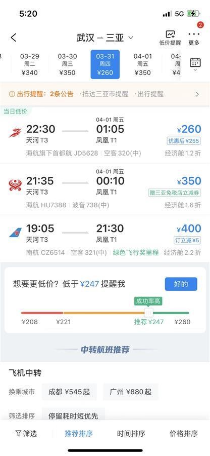 国内多地机票大跳水,武汉至三亚最低仅260元,新航季开启航司优化航线