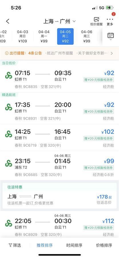 全国范围内,有部分地区机票票价甚至降到不足百元。据去哪儿平台显示,上海到多地的机票降幅超80%,裸票不足100元。其中,4月5日,上海到三亚、长沙、广州等地的机票仅售92元。