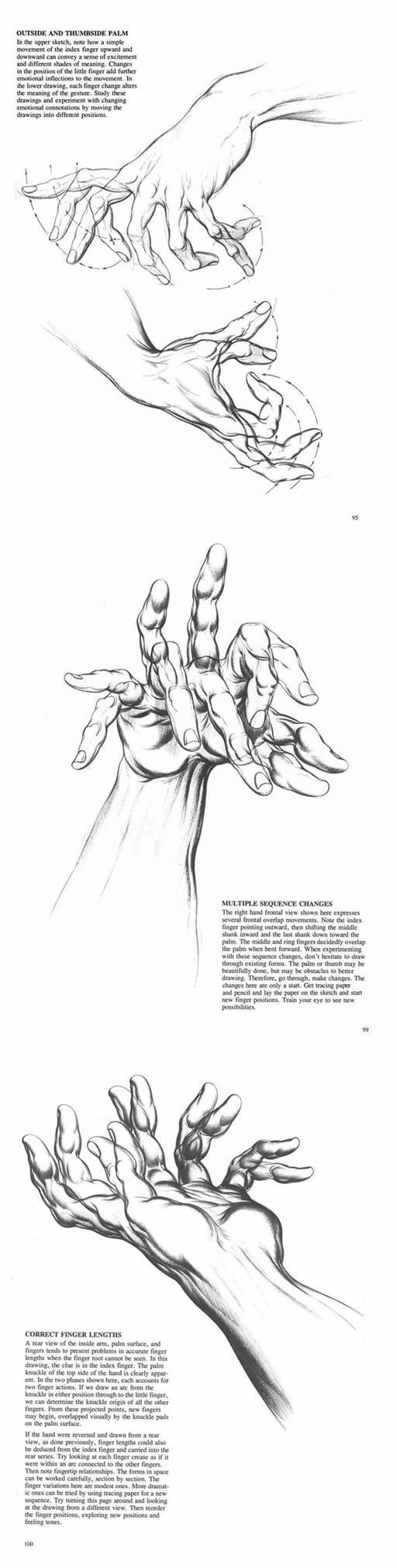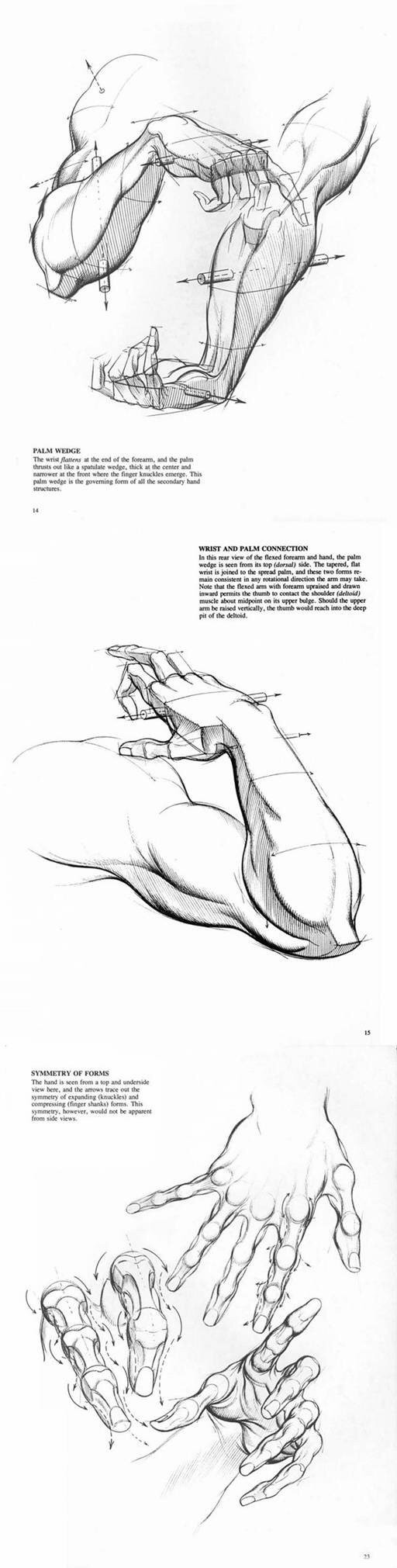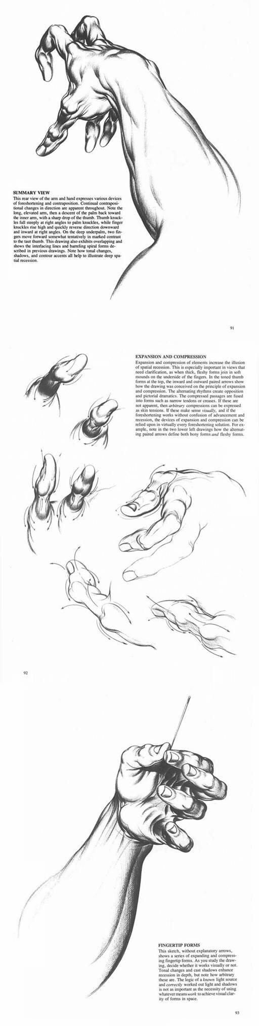 体会到手上的椭圆形的螺线,会使你自然而然的对造型有所领悟,并且在表现得手的强烈的透视短缩现象。或者如下图所示,要表现叉开或者卷拢的手时,可以用这些椭圆形的螺线把手的形状勾画出来。