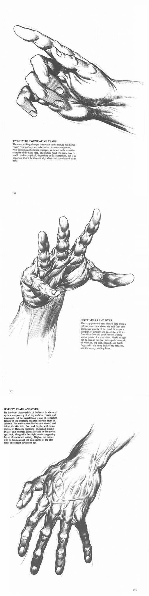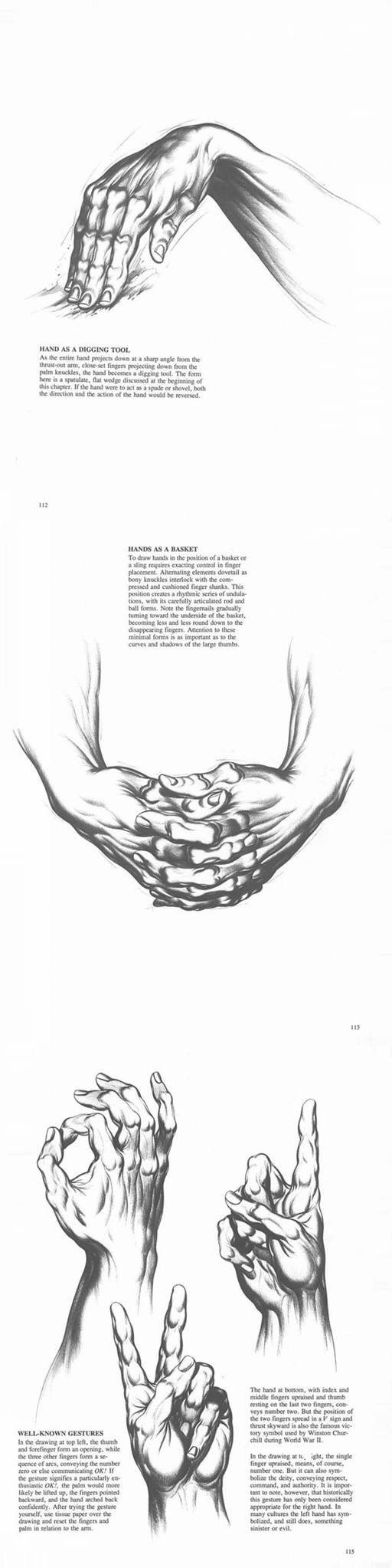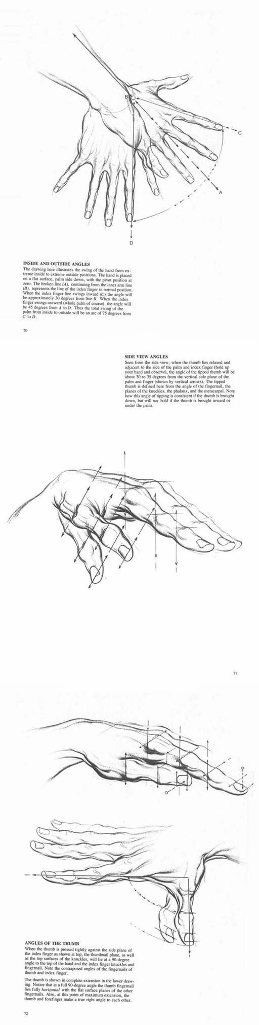 体会到手上的椭圆形的螺线,会使你自然而然的对造型有所领悟,并且在表现得手的强烈的透视短缩现象。或者如下图所示,要表现叉开或者卷拢的手时,可以用这些椭圆形的螺线把手的形状勾画出来。