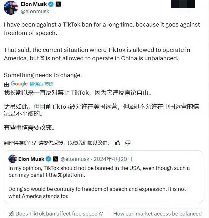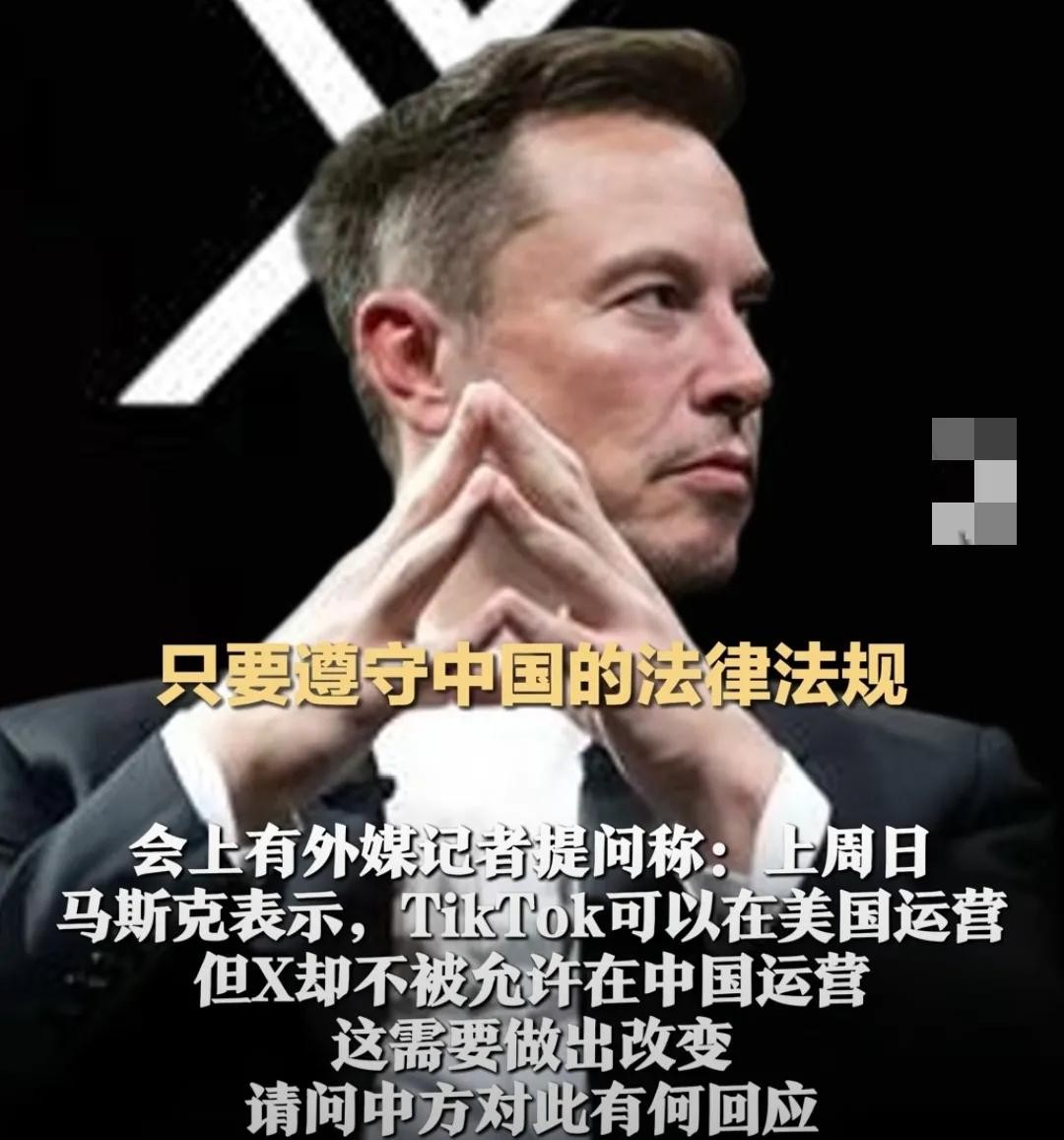 正当我以为特朗普是良心发现,释放出善意信号的时候,那边马斯克就闪亮登场,声称既然TikTok既然能在美国运营,那么他的X平台也应该被允许在中国运营