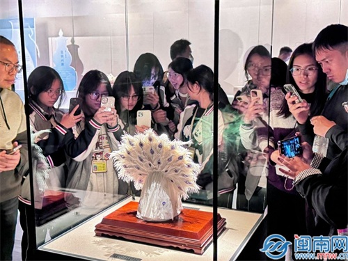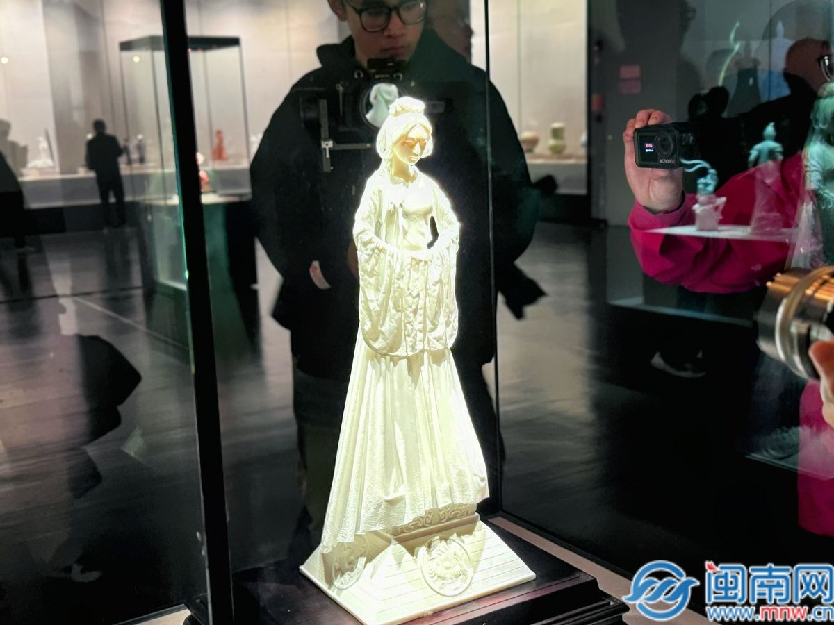 走进博物馆三楼展厅,闽台陶瓷艺术精品展就设于此,一件件巧夺天工的陶瓷作品吸引了不少人。“玉漱公主”的雕像静静地伫立在人群之中,她的头发丝根根分明,裙摆飘逸灵动,每一处细节都透露着工匠的匠心独运。