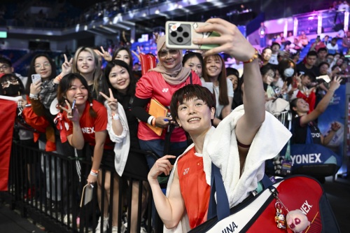 1月11日,王祉怡(前)赛后与球迷自拍留影。 新华社记者 程一恒 摄