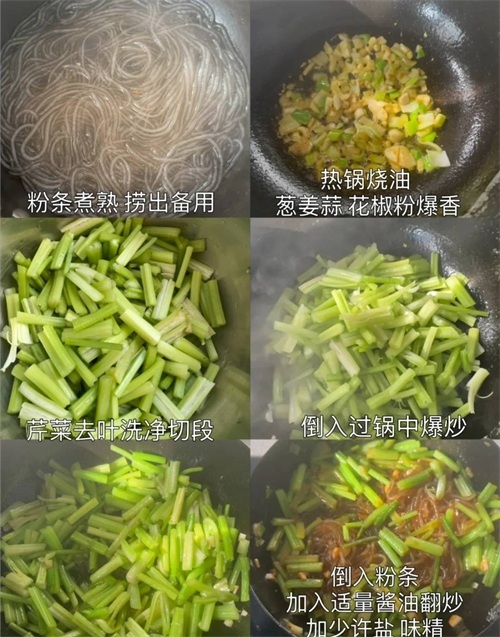 小窍门:热锅冷油,防止粘锅。油热后,放蒜姜葱辣椒爆香,大火快炒芹菜,变软后加粉条翻炒,放生抽老抽蚝油调味,最后加盐。十几分钟搞定!
