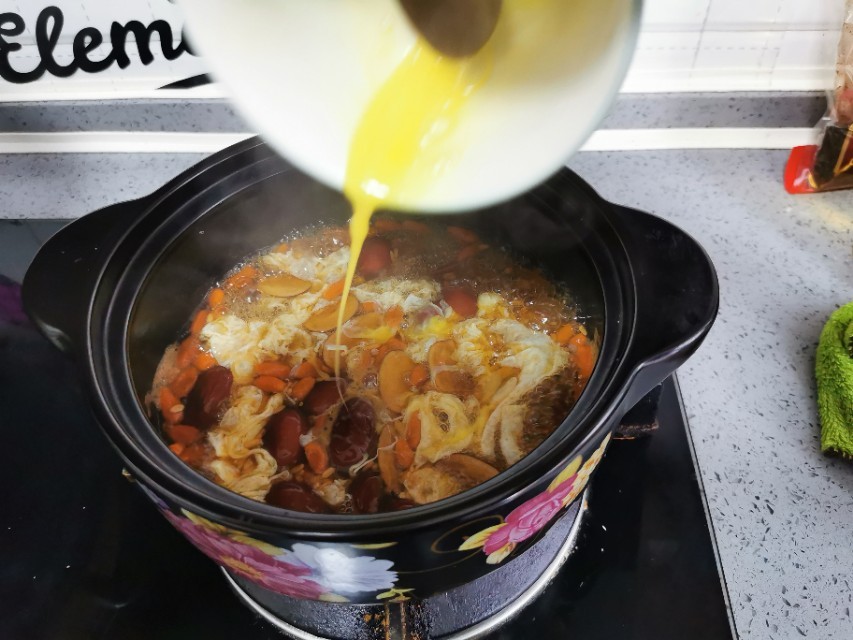 关火后,利用砂锅的余热,打入鸡蛋液,用勺背划开即可食用