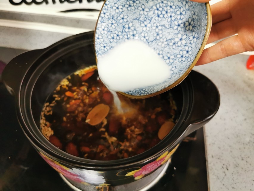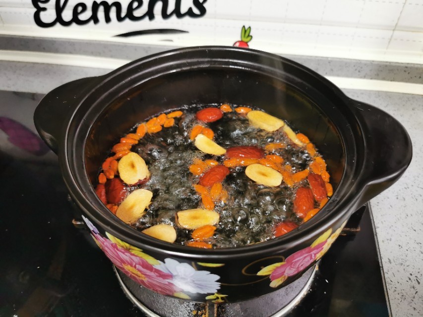 红枣切开去核,砂锅里放入红枣和枸杞,加入1升水,煮沸后,转中小火焖煮10分钟。