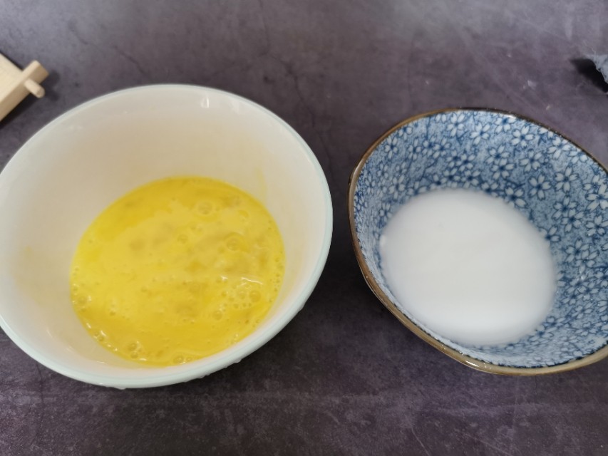 准备鸡蛋打散备用,玉米淀粉加水化开备用。