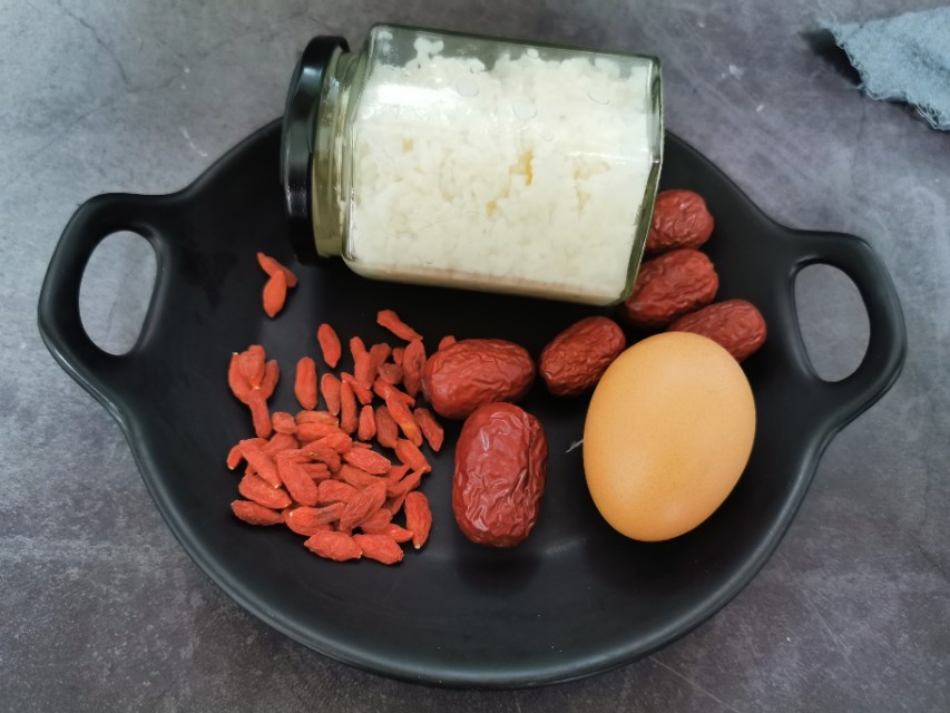 食材:醪糟2勺,枸杞1把,红枣6颗,鸡蛋1个,红糖20克,玉米淀粉适量
