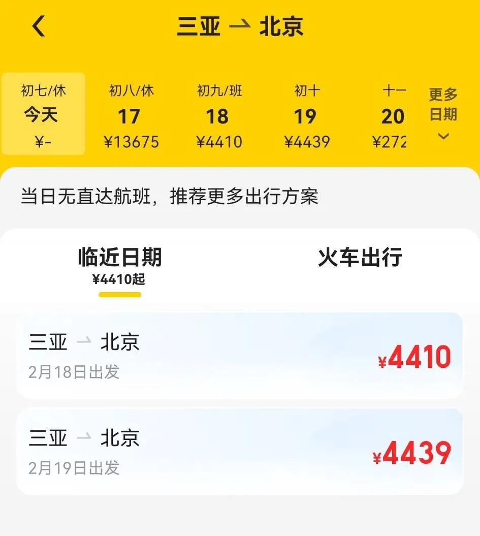 我刚查了一下 三亚—北京的飞机票是最贵的是13000多,考虑到明天是最后一天假期,又是假期返程高峰期,这也是能理解的。