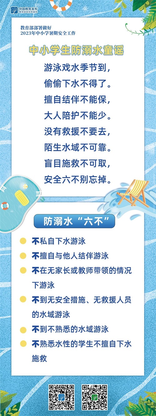暑假来临,教育部近日印发《关于做好2023年中小学暑期安全工作的通知》,部署做好相关工作。其中,中小学生防溺水童谣朗朗上口,还有防溺水“六不”原则,和教育小微一起读起来↓↓↓