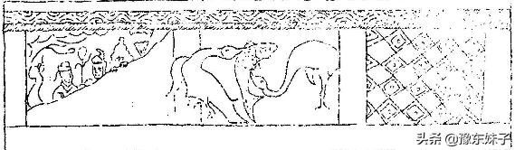 在古人看来,鱼、蛇、蛙等动物是可以自由出入墓葬的,可能会对墓主的尸体造成损害,如果尸体不能完整保存,墓主还魂再生的希望就不能实现,因此,汉代人常在墓门上刻画大鸟形象“啄鱼”或者“衔蛇“,以达到保护墓主尸体的目的。如下图在一画像石画面中:格沿三条大鱼正向格外游离,而格中两只略显肥壮的大鸟刚刚驱逐了三条大鱼后,正相背而立,回首衔啄意欲从两鸟之间潜入墓室的大鱼。