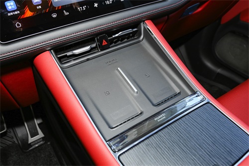 在空间布局上,问界新 M5 Ultra 展现了对用户需求的深度洞察。家族化怀挡设计释放出 14.4L 的中控储物空间,容积较前代增加 3 倍,足以容纳笔记本电脑、女士手提包等大件物品。后排双 HUAWEI Maglink® 接口支持多设备联动,无论是商务办公还是家庭娱乐,都能轻松应对。
