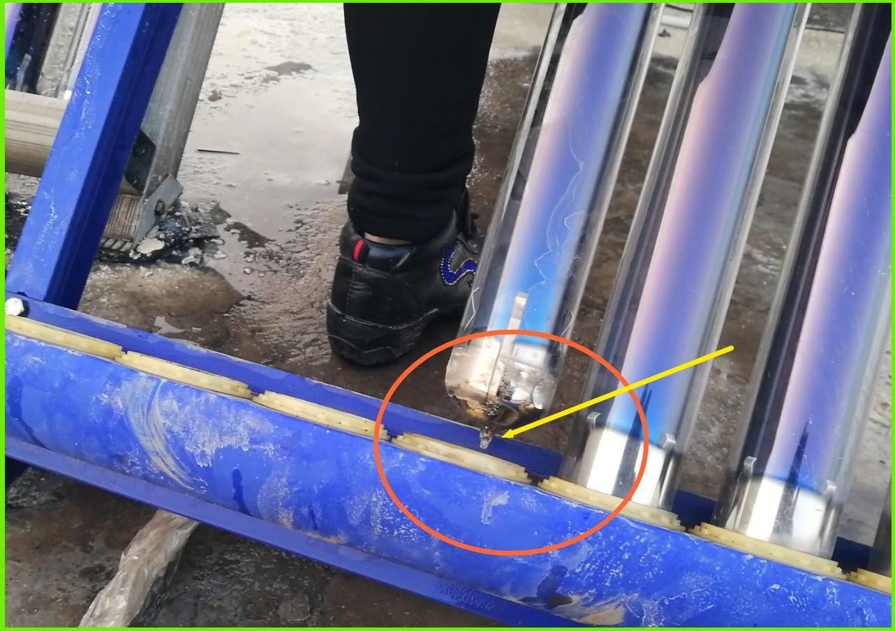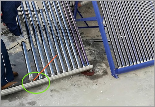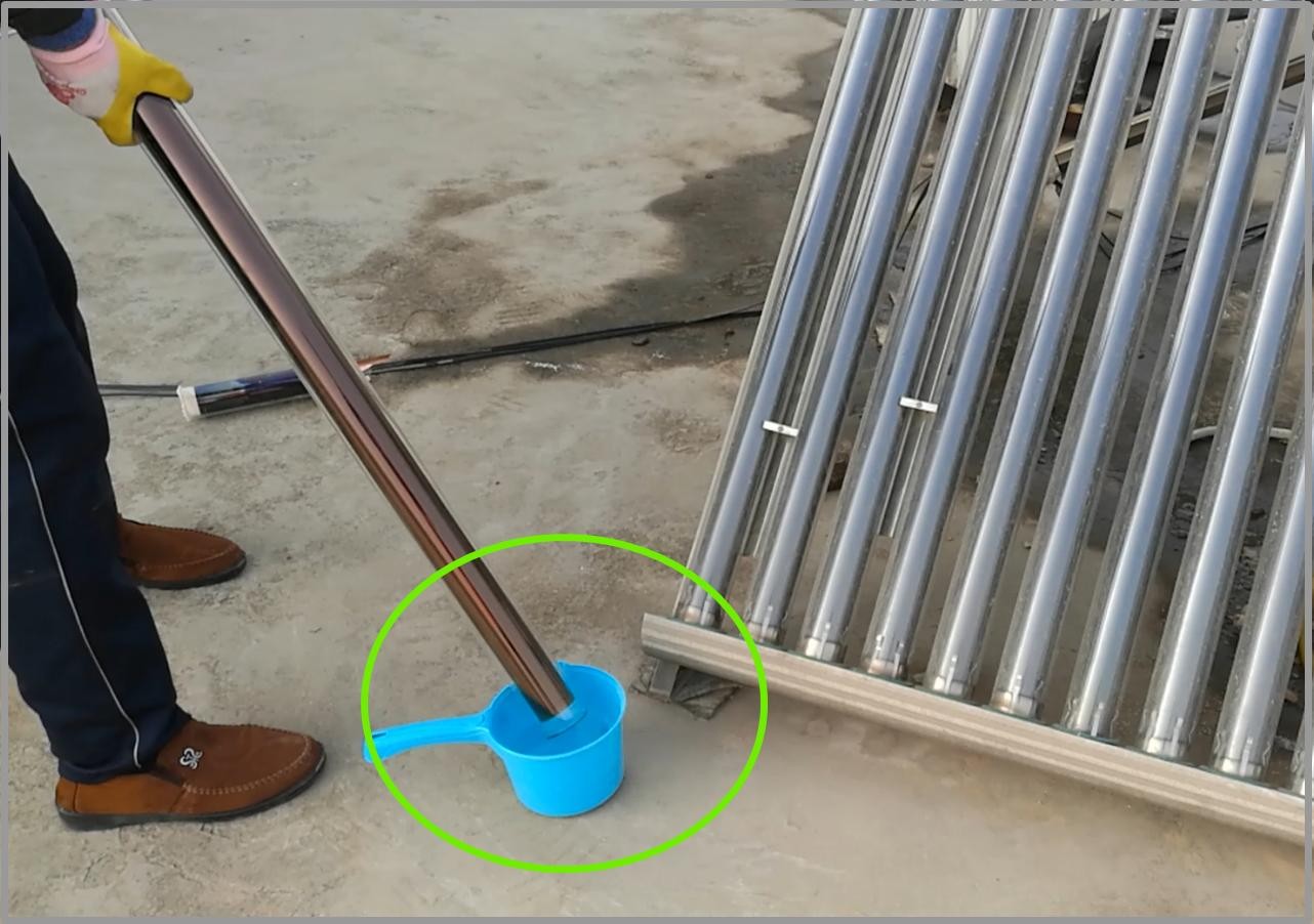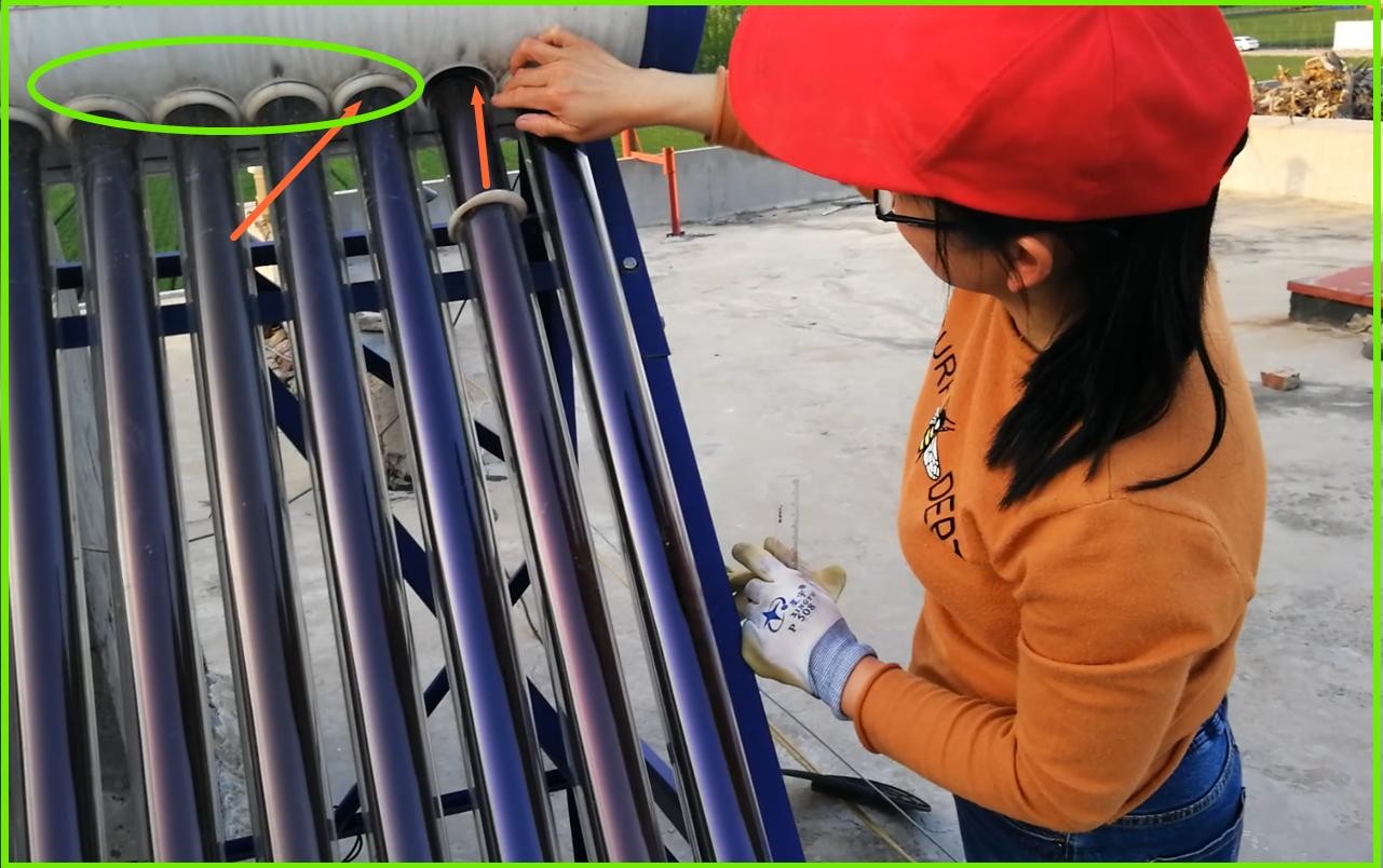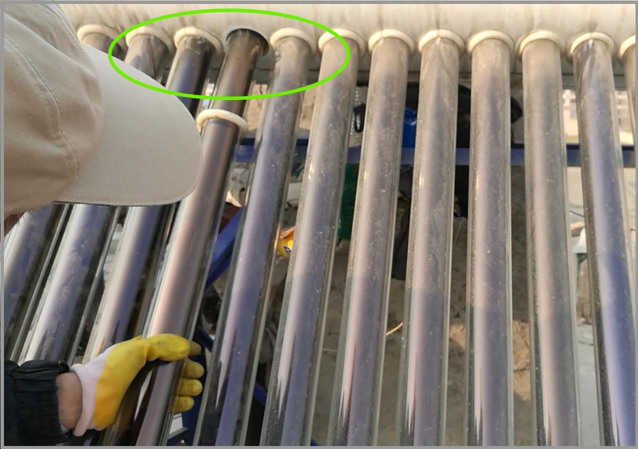 敲黑板:这一步有一个重要部件要小心保护,在真空管底部有一个细而尖的玻璃嘴,务必保护好,万一不小心碰断了,将失去真空无法保温,无法提供家居生活厨卫热水,需要更换方能解决,如果当地没有卖的,一时半会买不到会影响使用。