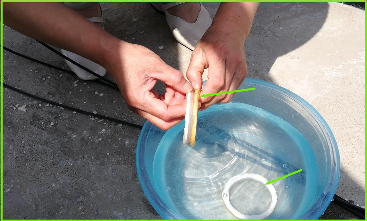 从管口伸进食指,就能轻松扣出橡胶圈,顺手把它放到水中,不要让风吹日晒到,干燥以后不易清理,清理时也容易弄伤表面。湿润状态下,用手稍稍搓洗即可清理干净,然后放水盆中备用。