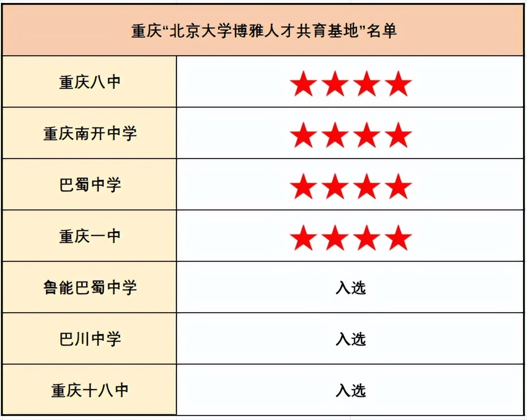 入围中学有几个学科入围共育基地,就被评为几星。能够入围北大博雅人才共育基地的高中无疑都是各省乃至全国实力雄厚的高中,是北大重要的优质生源高中。以下是重庆获得“北京大学博雅人才共育基地”称号的学校