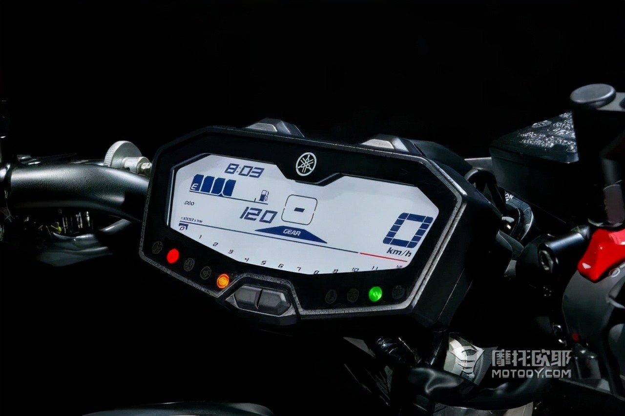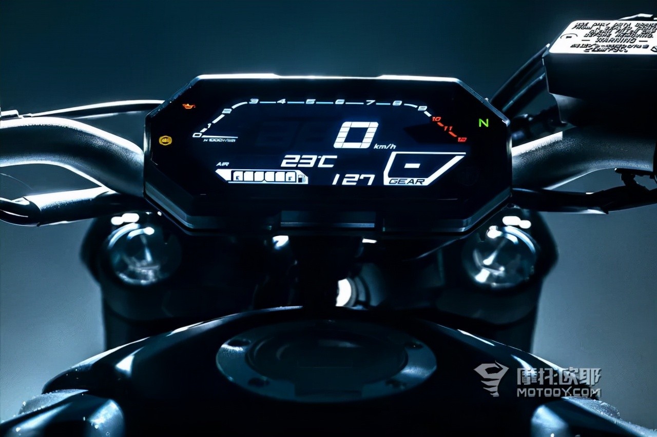 MT-07的仪表也进行了重新设计,从风格上来看更加贴合目前的暗黑风格。除此之外新款MT07还适配了一个新的车把,比老款车把宽了32mm,并且加高了19mm,总的来说更加适合操控。
