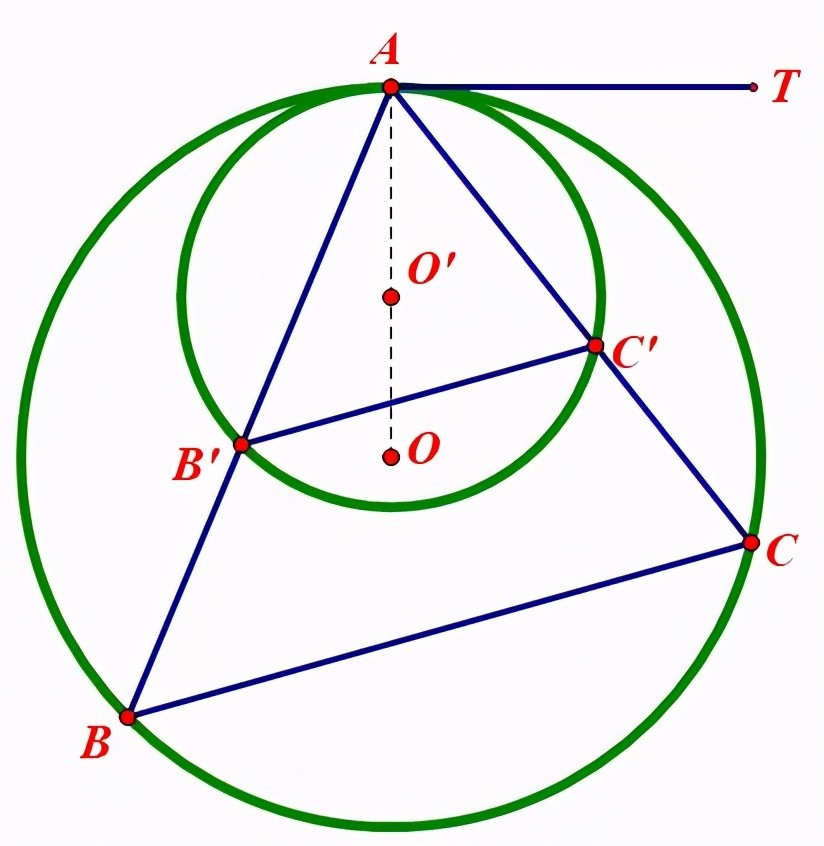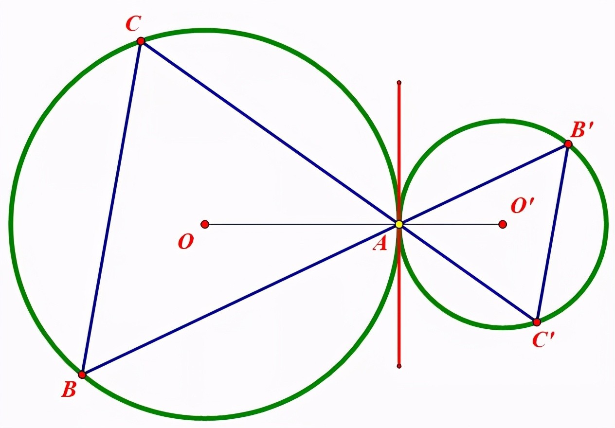 (4)过A的直线与两圆交于B,C;B’,C’,若BC//B’C’则两圆相切于A。这是因为△ABC和△A’B’C’以A为位似中心位似,故他们的外接圆也以A为位似中心位似,故两圆相切于A。
