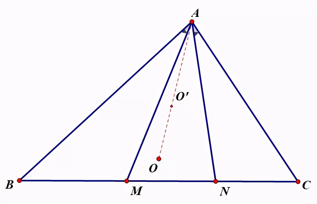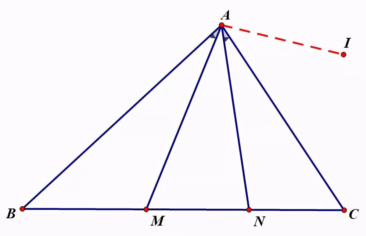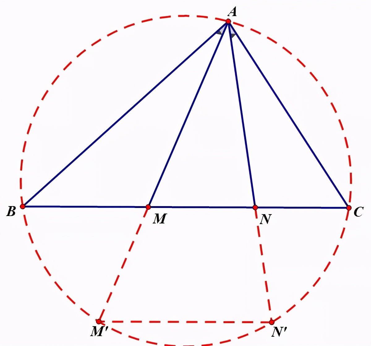如图,在ΔABC中,M、N是BC边上不同的两点,使得直线AM和AN关于∠BAC内角平分线对称,