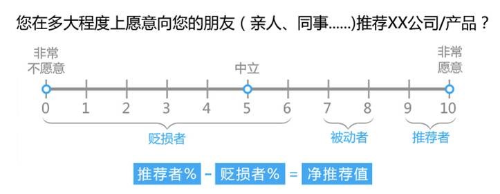 请用户回答“您在多大程度上愿意向您的朋友(亲人、同事……)推荐XX公司/产品?”根据用户的推荐意愿,将用户分为三类:推荐者(得分在9-10之间)、被动者(得分在7-8之间)、贬损者(得分在0-6之间)。