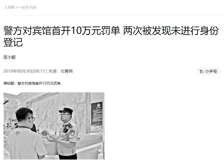 人民网 警方对宾馆首开10万元罚单 两次被发现未进行身份登记