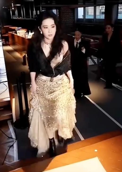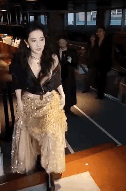 生图中的刘亦菲令人惊艳,即便镜头模糊,她的五官依旧相当优越,面部折叠度极高,作为一众黑色中独特的璀璨金色,刘亦菲真的太耀眼了。