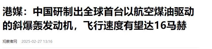 观察者网2025-02-27 13:16——港媒:中国研制出全球首台以航空煤油驱动的斜爆轰发动机,飞行速度有望达16马赫