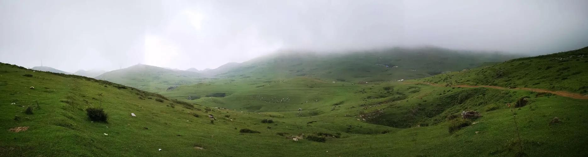 百草坪海拔2400~2800米之间,属多雾地带,清晨大多被雾笼罩,但这里的雾却要淡薄一些,给人一种缥缈虚幻的感觉。或许因为这里的天比其他地方的更高朗,土地比其他地方的更宽阔,因此,风景比其他地方的更圣洁清雅。站在雾中,四周的景物依稀可辨,轻柔地晃动着的雾,就像一块白色的半透明的薄纱,使所有的景物都变得夸张,变得抽象,变得似是而非。山草树木欲露欲隐,一副羞答答的样子,让人联想“犹抱琵琶半遮面”的诗句。站在这样很文学味也很抒情味的雾中,唯有声音是真实的,清脆悦耳的鸟鸣声,婉转悠扬的牧歌声,节奏分明的虫啁声,以及无处不在的牛羊唤青的长叫声,还有周围的气息也是真实的,泥土潮湿的气息,还有青草芬芳的气息,这真实的和虚幻的交融在一起,构成一个奇特的意境,让人产生一种似梦非梦的感觉。