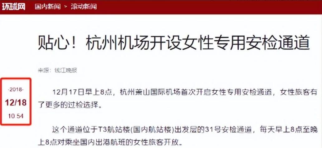 钱江晚报-2018年12月18日《贴心!杭州机场开设女性专用安检通道》