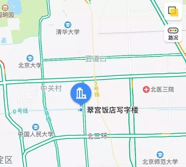 翠宫饭店西部是高新产业聚集的中关村,东部是主打商务办公的亚运村,而北边则是五道口,五道口向来被称为“宇宙中心”,聚集了北京大学、清华大学、北京科技大学、中国矿业大学等一众高校,研发人才聚集于此;Google中国研发总部、搜狐总部也位于此处。