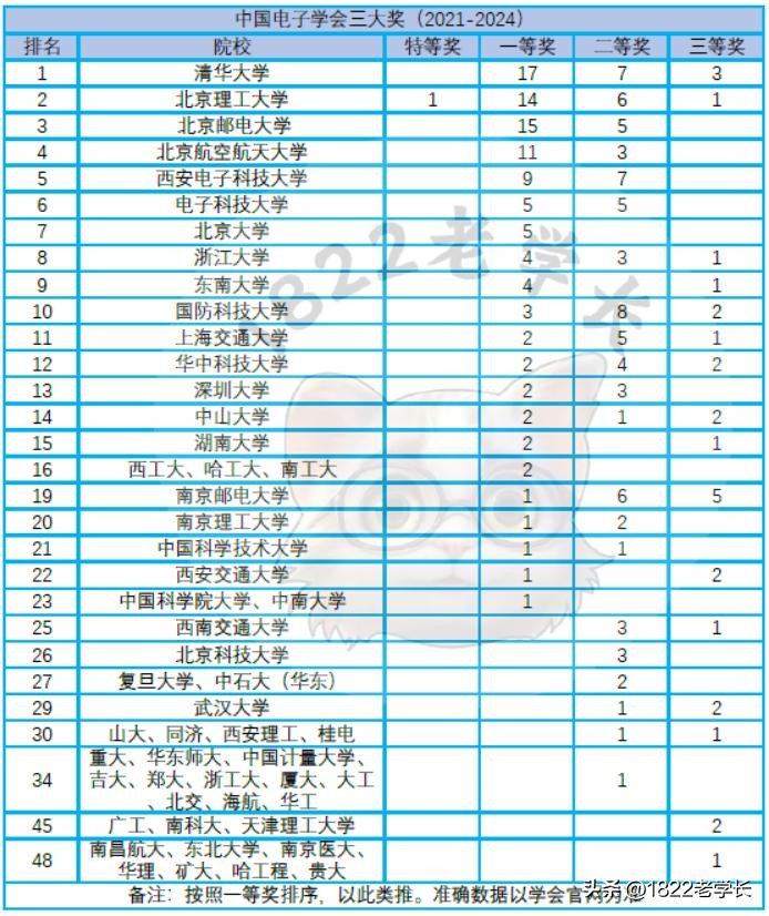 目前负责电子信息行业领域三大奖评选的是中国电子学会。2024年中国电子学会科学技术奖已经公示,单看一年的容易出现偏差,本文来看一下2021-2024共4个年度各校获奖情况,可以相对合理的评判近期各校重大科研成果的产出情况,属于最硬核的排名。