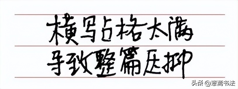 这个问题出现的更加普遍,对我们书法的学习的阻碍也最大,学生时代有的同学为了追求作业整齐,不仅底线上用尺子顶住,甚至用两把尺子顶住书写,写出的字完全变形,没有了汉字的美感。