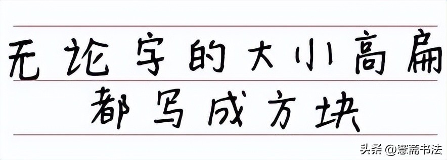 这个问题大家一定要重视,汉字的结体收放是非常美观的,包括每个字的大小都是汉字本身的特征,就是因为有了大小的不同,汉字书写才有了像音乐一样的节奏感,所以我们写字时候一定要注意大小自然,大字写大,小字写小。
