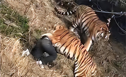 这个时候,野生动物园的工作人员终于赶到了现场,赶忙拿起叉子和棍棒驱赶老虎,在几个人的合力制服下,老虎才松开了口跑向了草丛深处。