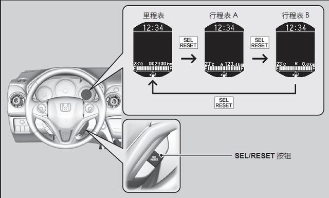 行程表:显示自上次重置后行驶的公里总数。可用行程表A和B来测量2个独立的行程。重置行程表若要重置行程表,先显示行程表,然后按住SEL/RESET按钮。行程表即被重置为0.0。