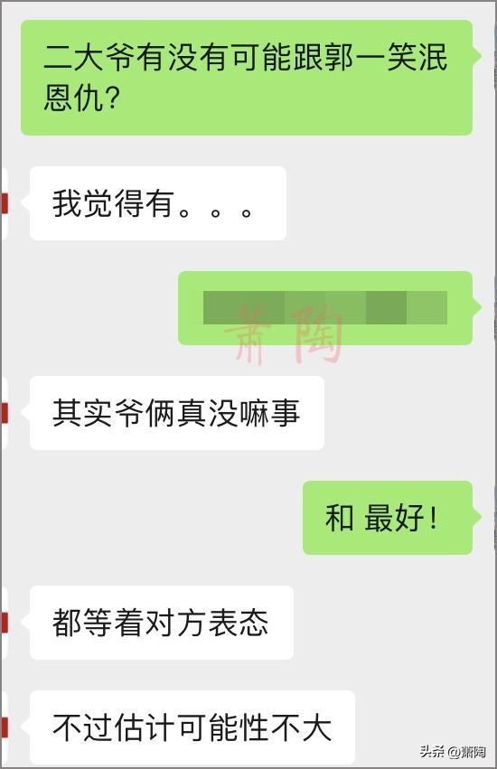 有网友曾问过萧陶这样一个问题,二大爷(指侯耀华)有没有可能跟郭德纲一笑泯恩仇?萧陶回答不了,就去问一位圈内的人。他的回答是:“我觉得有,其实爷俩真没嘛事,都等着对方表态,不过估计可能性不大。”