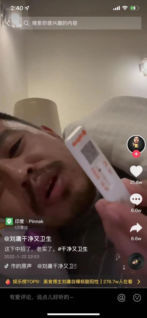 1月21日晚刘庸发抖音表示自己感染新冠称自己发烧身上疼腰像折了一样,视频快结束时刘庸还和粉丝开玩笑说:在印度这个地方得上这个也没什么好稀奇的,我停更了,要什么时候更新就说明病好了,要是一直不更新就说明什么……网上瞬间激起千层浪,但仍有网友指责他靠新冠军来博眼球赚取流量。