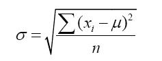若没有系统误差,且测定次数无限多(或实用上n>30次)时,则总体平均值μ就是真实值T。此时,用σ 代表总体标准偏差,其数学表示式为: