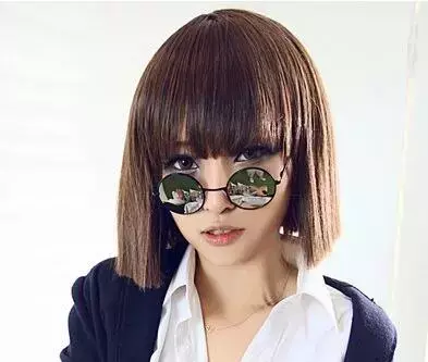 齐刘海式的时尚短发发型,顺直式的头发,这样子的发型好看又可爱,平平的刘海和后面平平的发尾是呼应的,再搭配上墨镜以后,看起来 就更完美了。