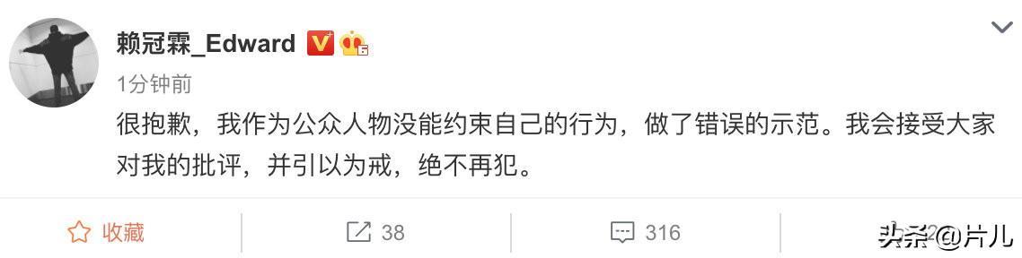 11月24日,赖冠霖在社交平台上发文道歉,表示作为公众人物没能约束自己的行为,给大众做了错误的示范。同时,赖冠霖还强调会接受大家对他的批评,并引以为戒“绝不再犯”。