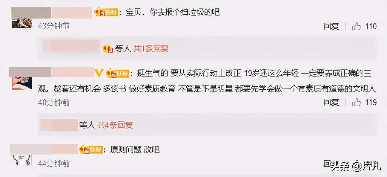 此外,还有网友特意留言“宝贝,你去报个扫垃圾的(工作)吧”、“挺生气的,要从实际行动上改正,19岁还那么年轻,一定要养成正确的三观……”、“原则问题,改吧”等表达自己的看法。