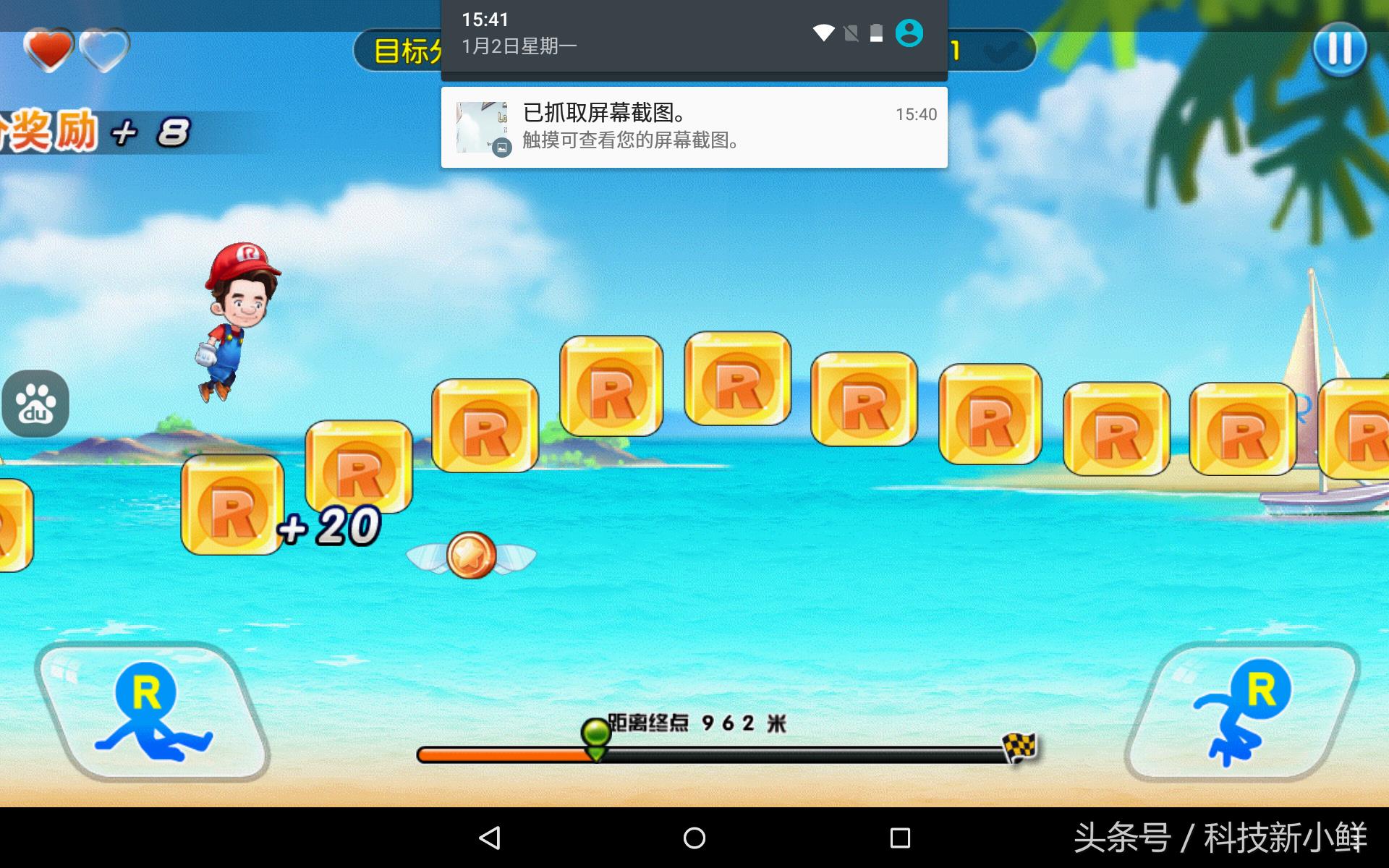 随意下了一款叫“奔跑吧兄弟”的跑酷游戏,在遇到障碍物需要跳和趴下的时候随着你的手指触动人物反应非常快,捡到礼物时候的特效也能够完美出现到消失,大屏幕在体验上比手机更胜一筹。