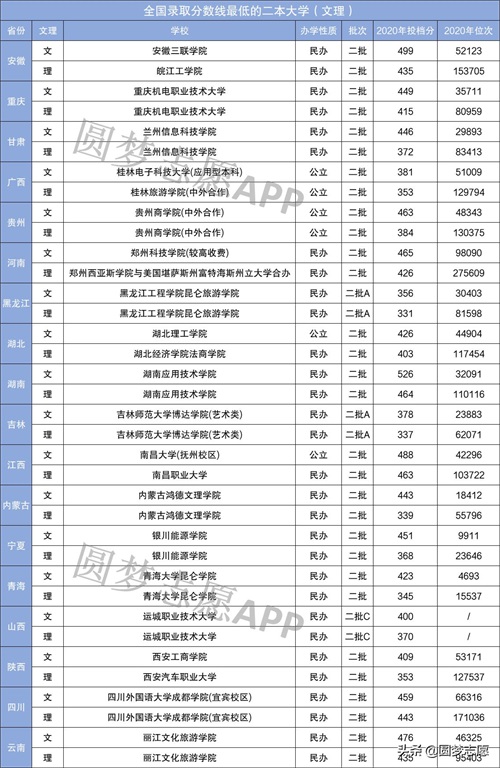 通过圆梦志愿APP提供的数据可知,全国录取分数线最低的二本大学如下: